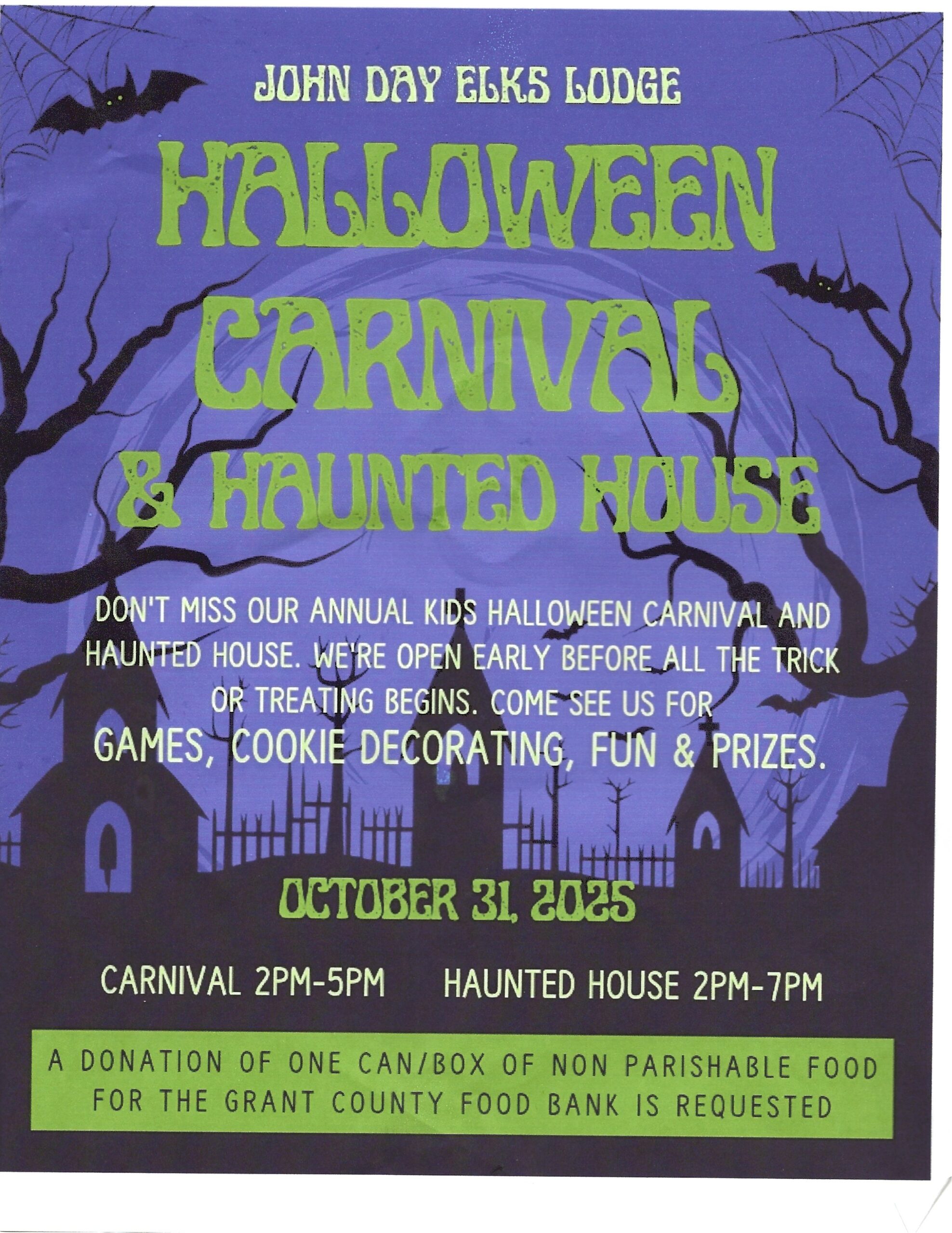 October 31 @ 2:00 pm - 7:00 pm John Day Elks Annual Kids Carnival and Haunted House John Day Elks Lodge John Day