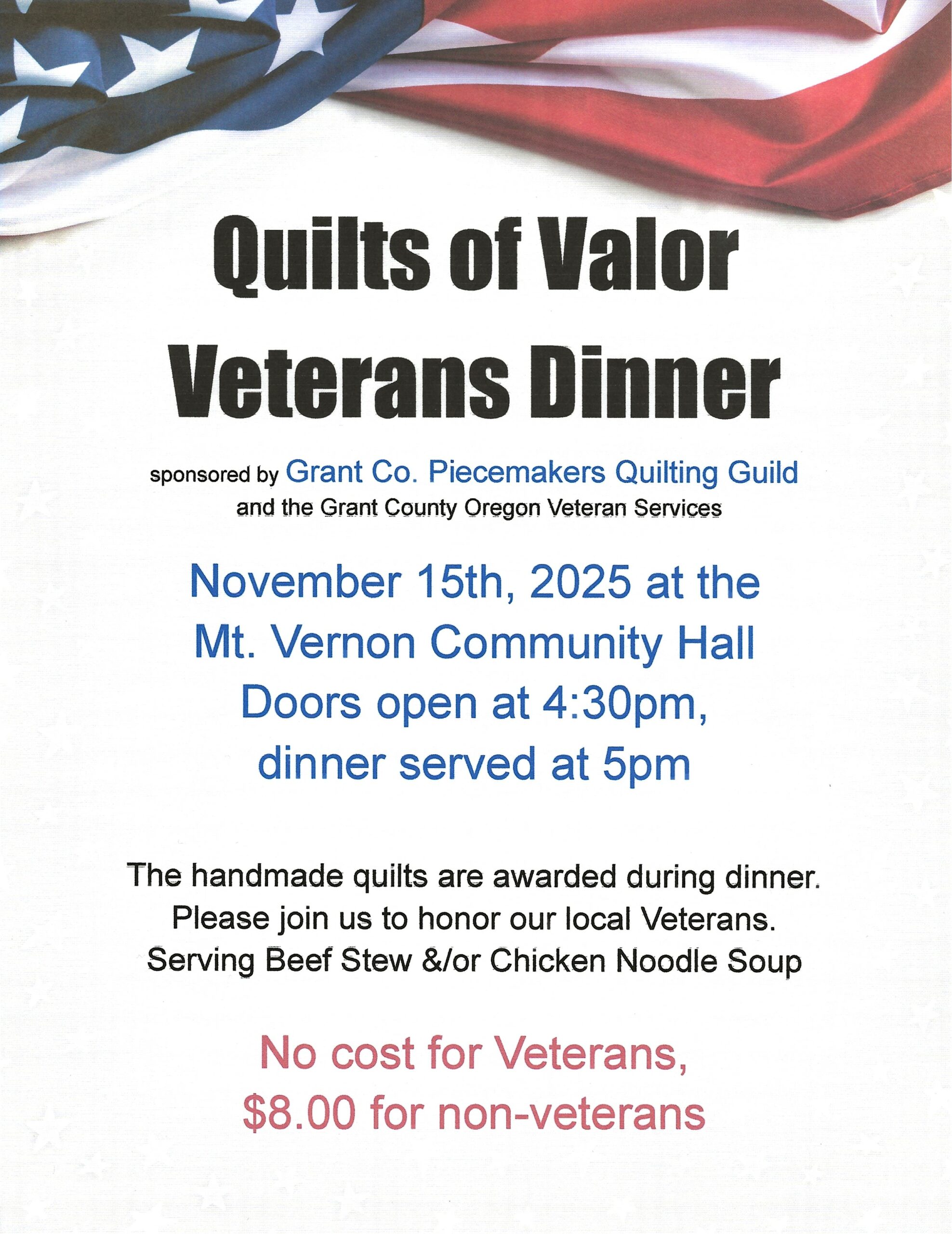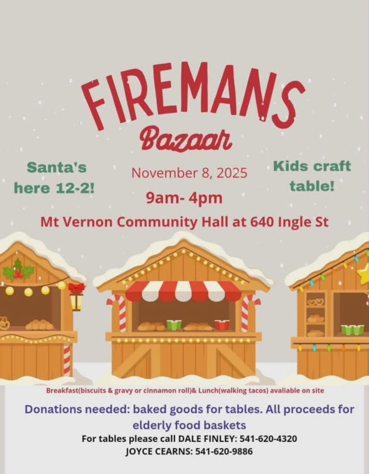 November 8 @ 9:00 am Mt. Vernon Firemans Bazaar Mt. Vernon Communtiy Hall 640 Ingle St, Mt. Vernon, Oregon