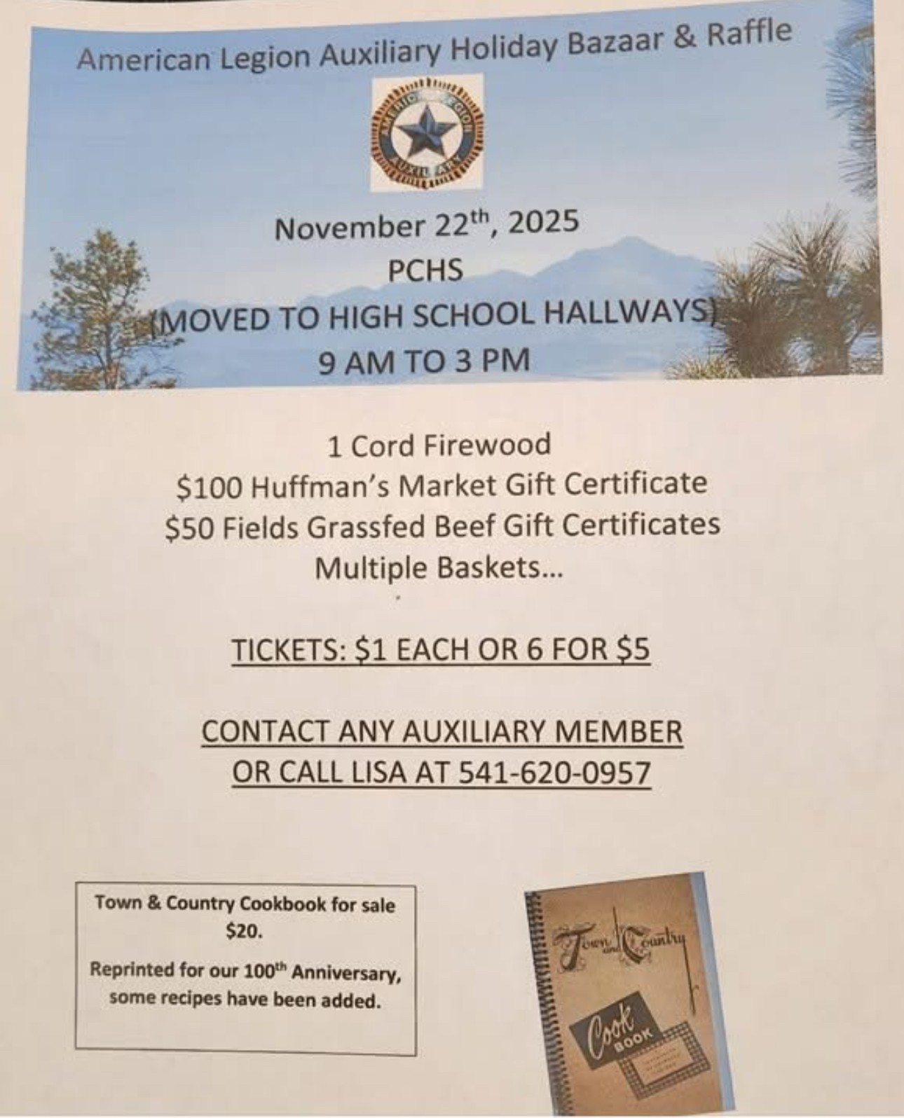 November 22 @ 9:00 am - 3:00 pm American Legion Auxiliary Holiday Bazaar and Raffle Prairie City High School Hallway