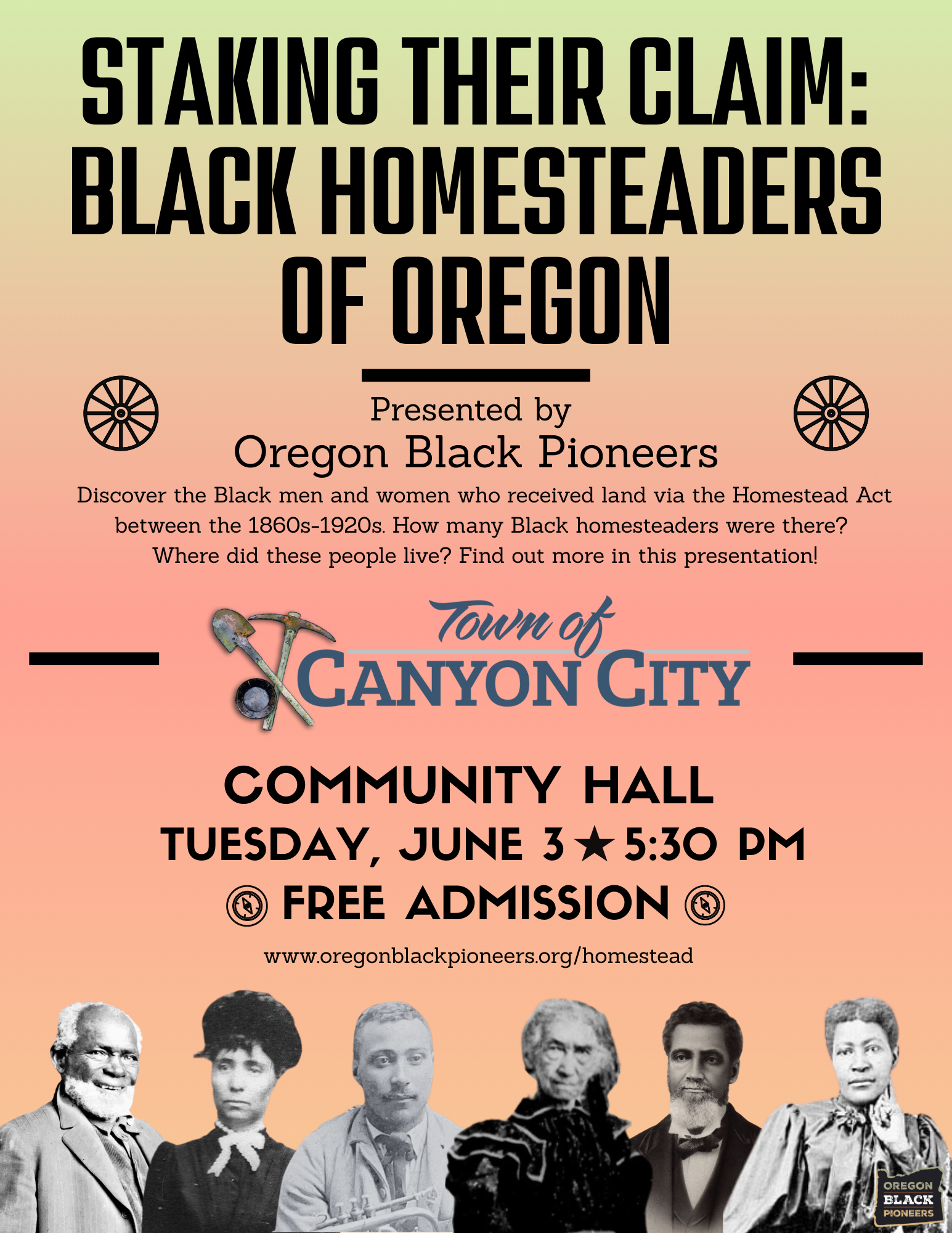 June 3 @ 5:30 pm - 7:00 pm Staking Their Claim: Black Homesteaders of Oregon Canyon City Community Hall